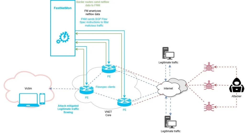 For precision, we use BGP FlowSpec. Once FastNetMon detects a signature that matches our fine-tuned rules, it dynamically generates and injects traffic-dampening rules into our edge routers.