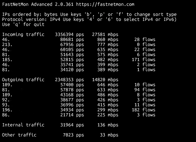 Total incoming pps: 3444529 packets per second Total outgoing pps: 64 packets per second Total incoming flows: 200 flows per second Total outgoing flows: 0 flows per second Incoming ip fragmented traffic: 0 mbps Outgoing ip fragmented traffic: 0 mbps Incoming ip fragmented pps: 0 packets per second Outgoing ip fragmented pps: 0 packets per second Incoming dropped traffic: 0 mbps Outgoing dropped traffic: 0 mbps Incoming dropped pps: 0 packets per second Outgoing dropped pps: 0 packets per second Incoming tcp traffic: 0 mbps Outgoing tcp traffic: 0 mbps Incoming tcp pps: 24 packets per second Outgoing tcp pps: 29 packets per second Incoming syn tcp traffic: 0 mbps Outgoing syn tcp traffic: 0 mbps Incoming syn tcp pps: 0 packets per second Outgoing syn tcp pps: 0 packets per second Incoming udp traffic: 32442 mbps Outgoing udp traffic: 0 mbps Incoming udp pps: 3444501 packets per second Outgoing udp pps: 32 packets per second Incoming icmp traffic: 0 mbps Outgoing icmp traffic: 0 mbps Incoming icmp pps: 0 packets per second Outgoing icmp pps: 0 packets per second